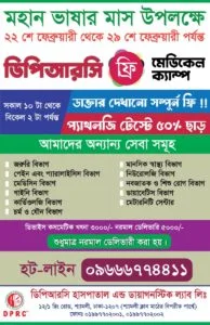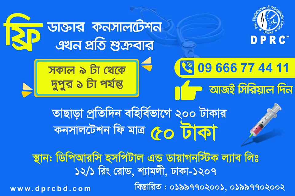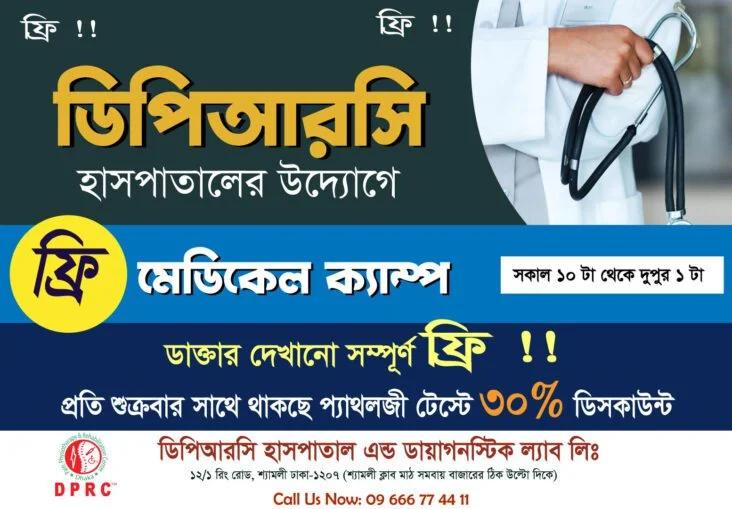 সম্পূর্ণ বিনামূল্যে (ফ্রি) এমবিবিএস ডাক্তার দেখাতে চলে আসুন “ডিপিআরসি ফ্রি মেডিকেল ক্যাম্প” -এ এবং সাথে পাচ্ছেন প্যাথলজী টেস্টে ৩০% পর্যন্ত ডিসকাউন্ট।
