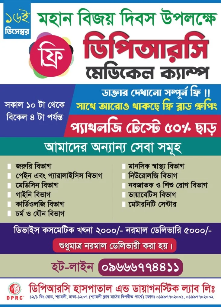 ডিপিআরসি হাসপাতাল এন্ড ডায়াগনস্টিক ল্যাব লিমিটেড-এর পক্ষ হতে আগামী ১৬ ই ডিসেম্বর ২০২৩ রোজ শনিবার মহান বিজয় দিবস উপলক্ষে একটি ফ্রি মেডিকেল ক্যাম্প আয়োজিত হবে।